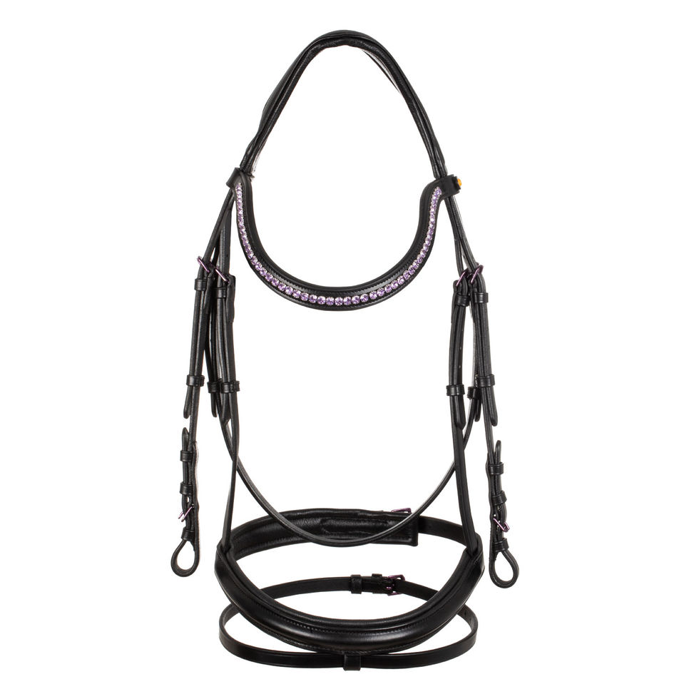 Testiera inglese in morbido cuoio italiano di alta qualità. Fibbie in acciaio inox placcate in violetto garantiscono sicurezza, stabilità e resistenza nel tempo. Con frontalino nero di riserva