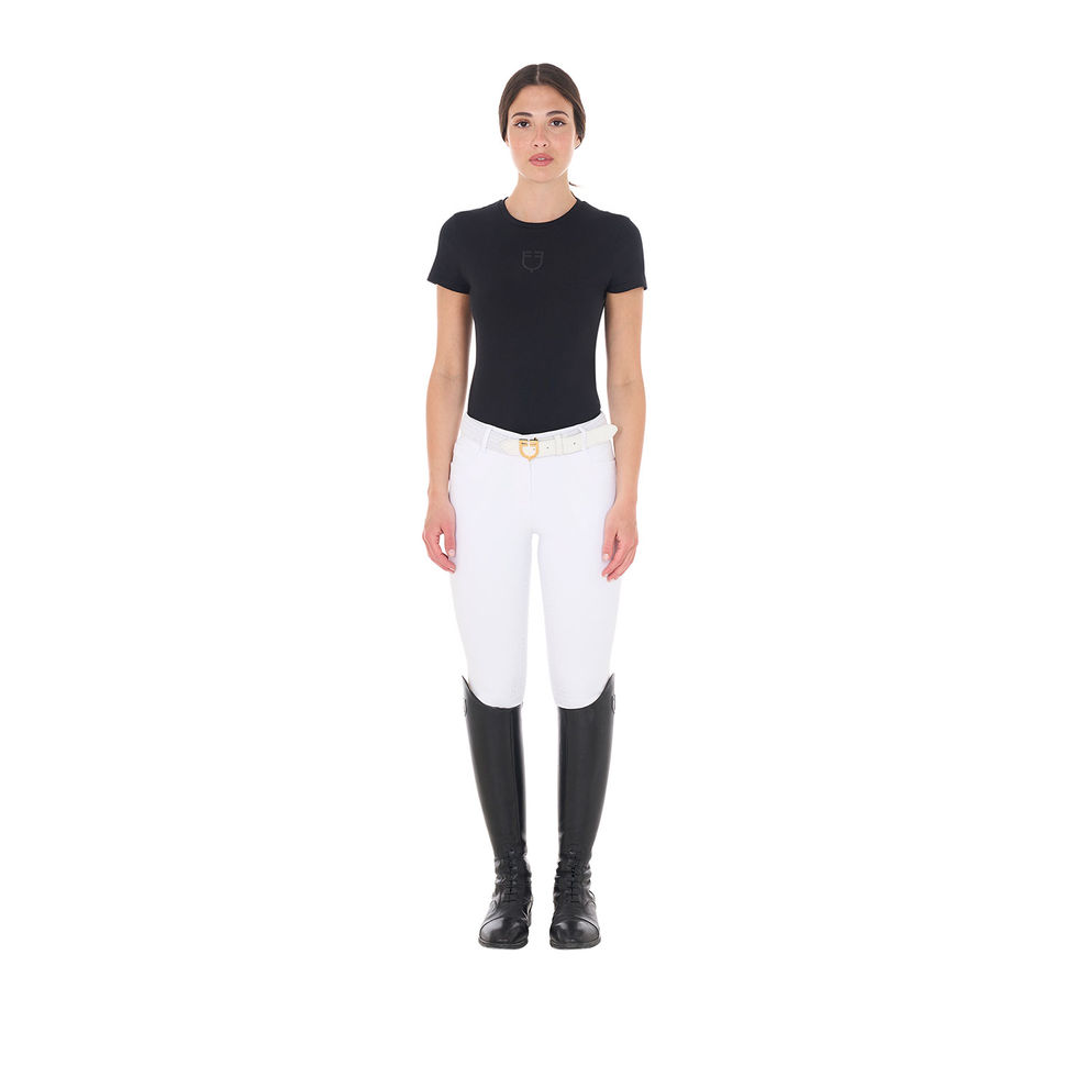 T-shirt donna slim fit in cotone a manica corta con stampa basic tono su tono. Stile perfetto, vestibilità impeccabile ed eleganza senza tempo.